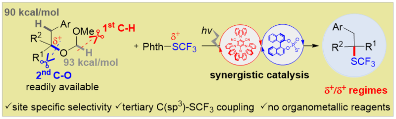 2018年初,谢劲与朱成建团队首次实现了可见光与硫醇协同催化的亚胺极反转硼氢化修饰(Angew. Chem. Int. Ed. 2018, 57, 3990)。最近,该团队通过对该协同催化体系进一步深入研究,成功解决了目前三氟甲硫基化研究领域存在的重要挑战,实现了温和条件下三级叔醚的专一选择性C-O键自由基三氟甲硫基转化。该方法具有非常好的的官能团耐受性和区域选择性,对于键能较低的苄基C-H键也能很好兼容。该项工作为构建具有位阻的三级烷基三氟甲基硫醚制备提供了一条全新的合成思路,相关研究工作已经申请中国专利保护(谢劲等,一种制备三级烷基三氟甲基硫醚的方法,专利申请号:201810431033.X)。