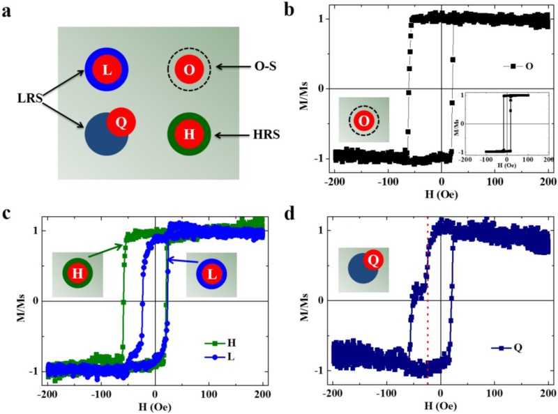 图2. 电场调控的交换偏置效应。(a) FMOKE测量时激光光斑打在样品上不同位置时的示意图,L、O、H分别表示低阻态、原始态和高阻态,Q表示跨越低阻态和原始态的组合态;(b), (c)和(d)分别是激光光斑打在O、H/L、Q位置用FMOKE测得的磁滞回线,(b)图中的插图是Pt(50 nm)/Co(6 nm)/Pt(50 nm)薄膜样品的磁滞回线。