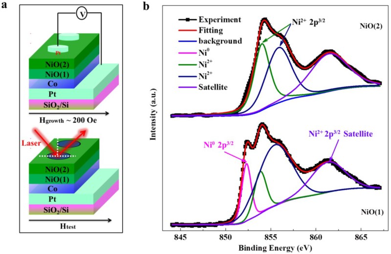 图 1. 电性、磁光测量示意图和XPS谱线。(a) Si/SiO2/Pt/Co/NiO(1)/NiO(2)/Pt器件的I-V 曲线(左上图)和移除Pt顶电极后FMOKE(左下图)测量的结构示意图;(b) 两层NiO薄膜即NiO(1) (右上图) 和 NiO(2) (右下图)的XPS 测量结果。