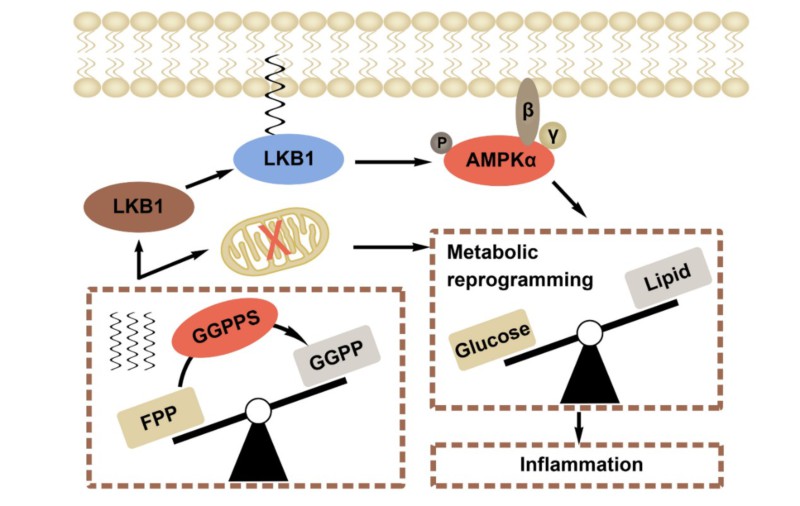 肝癌是世界范围内癌症所致死亡的第二大因素,而中国占世界肝癌死亡人数的一半。肝细胞癌(HCC)是肝癌的主要形式,由环境致癌物,肝炎病毒,酒精和肥胖等危险因素共同造成。随着乙肝疫苗的普及接种,献血源及血制品的严格筛查以及对发霉食物的警惕,我国肝癌发病率和死亡率得以控制,而非酒精性脂肪肝(NAFLD)日益成为现代人患HCC的主要原因。因而,明确决定NAFLD向肝纤维化、肝硬化乃至肝癌转化的关键调控因子对于早期干预肝脏疾病的恶化具有重要意义。李朝军、薛斌课题组研究发现,蛋白质异戊二烯化关键酶:香叶基香叶基焦磷酸合成酶(GGPPS)表达水平能够预测NAFLD病人的病程。他们进一步利用细胞模型和Ggpps肝脏特异性敲除小鼠模型分析了肝细胞代谢模式,结果表明,GGPPS能够通过异戊二烯化修饰LKB1和RAB7分别调节分解代谢和线粒体功能,进而影响肝细胞内糖脂代谢平衡及炎症反应,参与NAFLD向纤维化的进程(工作模式图)。