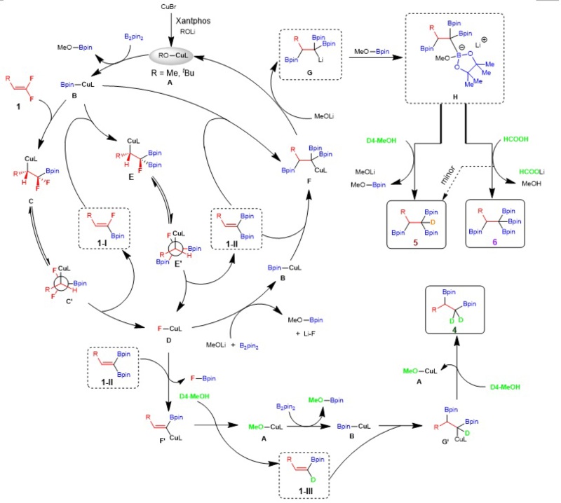 在硼酸酯类化合物中,一类在相同或相邻碳原子含有2个以上硼酸酯基的多硼化合物,由于硼、硼之间的协同效应,具有非常特殊的反应活性,它们可以高效地同时构建多个碳碳键和碳杂键,是一类非常重要的有机合成子,近年来广泛被人们研究。但是对于这些化合物的合成,研究比较少,特别是四取代多硼化合物几乎是空白。传统的方法往往是使用不同的原料,构建不同的产物。如何开发一种通用的方法,使用同样的原料就可以合成不同类别的多硼化合物是一项重要的挑战。近期,史壮志教授课题组利用铜催化实现了协二氟烯烃可调控切断C-F键,“一箭三雕”合成1,2-二硼、1,1,2-三硼以及1,1,1,2-四硼多硼化合物。该策略只需要对催化体系微调,就可以将同一协二氟烯烃选择性转化成三类多硼化合物(图1)。经过同位素实验,利用高分辨以及在线红外跟踪,中间体捕捉等实验分析,推导出一个非常复杂,但是合理的反应路径(图2)。该成果以“Highly tunable multi-borylation of gem-difluoroalkenes via copper catalysis”为题发表在Nature Catalysis(DOI: doi.org/10.1038/s41929-018-0147-9)在线发表,化学化工学院胡杰峰博士(现为凯发k8官网工业大学副教授)为该论文第一作者,配位化学国家重点实验室赵越老师负责其中单晶解析工作。