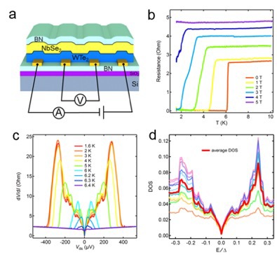 图 a)WTe2/NbSe2异质结器件结构示意图;b)WTe2被诱导实现超导;c)微分电阻(dV/dI-Vds)的震荡数据;d)理论计算WTe2超导的亚带隙反常特性。