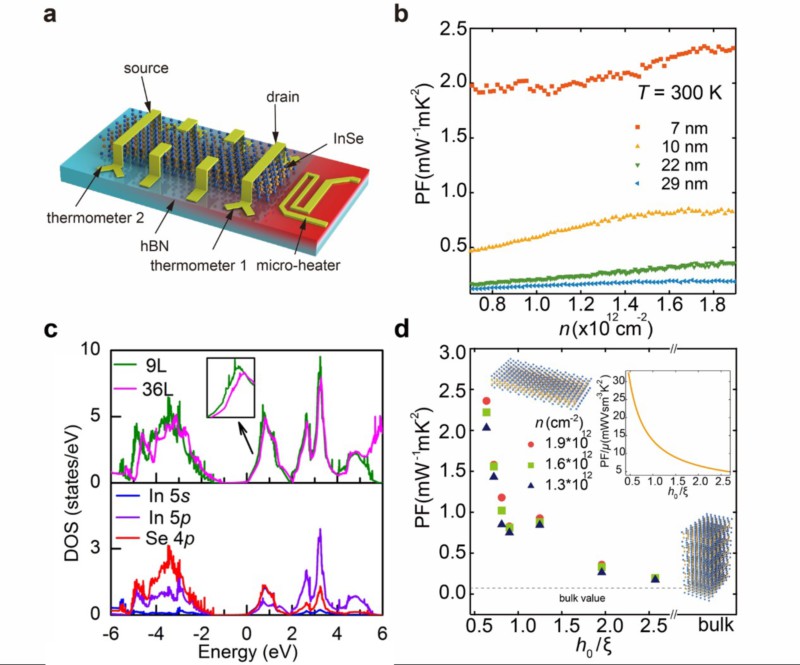 热电测试结构的示意图;(b) 常温下,7 – 29 nm的InSe功率因子随载流子浓度变化;(c) 9层和36层的InSe态密度分布;(d) 功率因子随样品的量子限域长度h0与热德布罗意波长ξ的比值h0/ξ的变化,随着h0/ξ减小而增强,尤其是在h0/ξ < 1的区间有显著的增强,与插图中的理论预测是一致的。