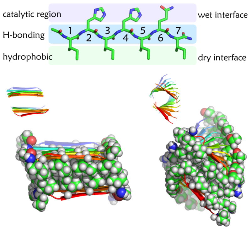 生物分子的自组装为构建具有生物相容性的纳米材料提供了可靠的途径。通过改变多肽链的氨基酸序列,可以制造具有不同形貌、不同功能的分子聚集体。2014年,W.DeGrado等人利用7肽链制备了淀粉状纤维结构的自组装聚集体,实现模仿碳酸酐酶有效催化二氧化碳的可逆水合反应。之后陆续又有利用类似分子机器进行催化氧化等相关的研究报道。尽管实验研究上取得了一些进展,但多肽链自组装的机理、聚集体的结构、影响催化活性的因素等诸多问题仍待解决。