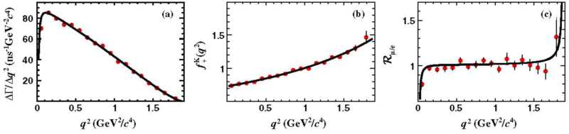 研究团队利用BESIII探测器采集的积分亮度为2.93fb-1的ψ(3770)数据,实现了对D0→K-μ+νμ衰变分支比、|Vcs|及f+K(0)的精确测量,并结合BESIII实验此前对D0→K-e+νμ的研究结果,对轻子普适性进行了检验。下图(a)、(b)、(c)分别展示了衰变率、形状因子、μ子道与电子道的衰变率比值的研究结果。图中带误差棒的点是测量值,图(a)和(b)中的曲线是拟合结果,图(c)中的曲线是理论预期。在现有的统计量下,没有观测到轻子普适性破坏的迹象,这个结果有助于人们理解B介子中的反常现象。