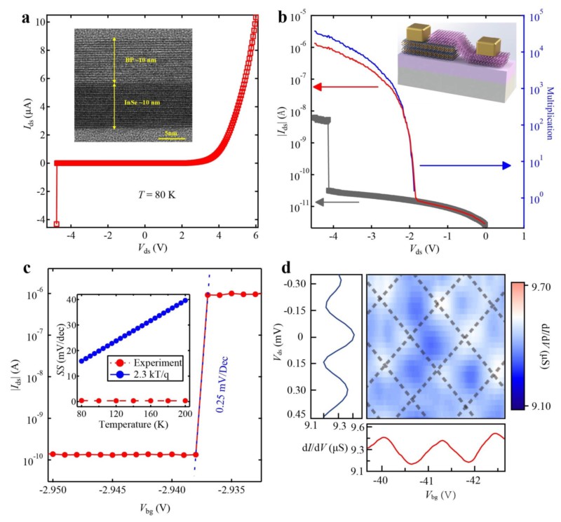 弹道雪崩现象与器件应用。(a) 弹道雪崩输出曲线,插图:InSe/BP垂直异质结器件。(b) 弹道雪崩光电探测器的响应图。(c)弹道雪崩场效应晶体管的场效应曲线,插图:器件亚阈值摆幅与温度的关系。(d) BP垂直方向观测到的Fabry-Perot量子干涉图案。