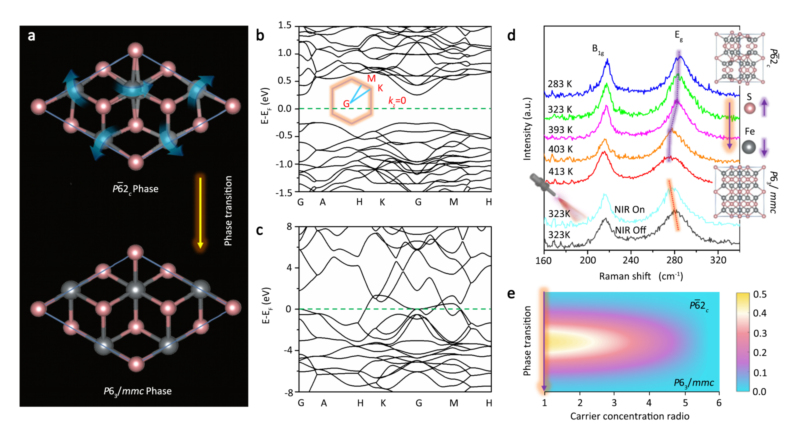 研究团队发现超薄的FeS相变温度大概在400K左右,会因为Fe原子的位移从扭曲的P6(-)2c相转变成高度对称的P63/mmc相,从而实现半导体—金属相变。通过原位拉曼技术监测Eg模式位移发现,光生载流子的大量注入会使得相变温度降低到~323K。理论的计算和光电探测表明红外光引入会通过电声子相互作用明显降低相变势垒。