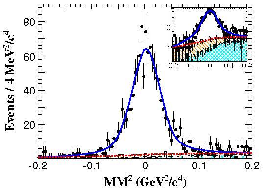 研究团队利用BESIII探测器上采集的积分亮度为3.19 fb-1、质心能量为4.178 GeV的数据,精确测量了Ds+→μ+νμ衰变的分支比,并得到了Ds衰变常数fDs和CKM矩阵元|Vcs|。这些测量值均是目前世界上最精确的实验结果。研究团队还结合Ds+→τ+ντ测量平均值对轻子普适性进行了检验,结果未观测到轻子普适性破坏的迹象。审稿人认为:“最近LHCb合作组在其他B和D介子的衰变中发现了味道异常,因此这个结果很及时,它对基础高能物理学有重要意义”。下图展示了中微子的丢失四动量平方分布,其中带误差棒的点是数据,蓝色实线是拟合结果,红色虚线是本底。