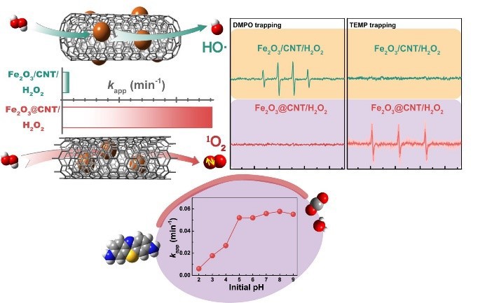 近期,课题组以经典的类Fenton催化体系为研究对象,选用多壁碳纳米管(CNT,内径~7 nm)为Fe2O3 (~2 nm)的模板载体,分别制备出管内与管外负载Fe2O3的复合催化剂Fe2O3@CNT与Fe2O3/CNT,比较研究了两种催化剂介导的类Fenton反应降解有机污染物的性能与机制。研究发现,Fe2O3/CNT-H2O2类芬顿体系降解有机污染物的活性物种为经典的羟基自由基(.OH),而Fe2O3@CNT-H2O2产生的活性物种仅为单线态氧(1O2),且相同条件下后者对亚甲基蓝的降解速率是前者的22.5倍。不仅如此,在pH值5-9的范围内,Fe2O3@CNT-H2O2均可保持高效稳定的污染物降解性能,这有望拓展类芬顿催化剂在碱性条件下的应用;另外,限域催化体系可选择性氧化易被吸附的有机污染物,氧化速率与吸附亲和力成线性关系。作者推测,碳纳米管的限域结构从动力学与热力学两方面影响了Fenton催化的反应路径。这项工作有望为限域条件下环境纳米新技术的发展提供重要参考。