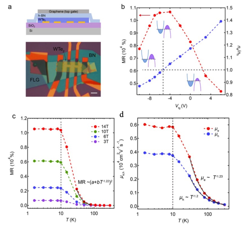 a. h-BN保护的WTe2薄膜器件图(下)及器件侧视示意图(上)。 b. 磁电阻以及电子空穴浓度比随栅压的变化。c.磁电阻随温度变化曲线。d. 迁移率随随温度变化曲线,插图:电子空穴浓度比随温度变化曲线。