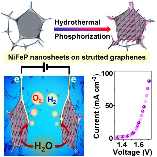 近日,现代工程与应用科学学院王学斌教授课题组在电催化水分解研究领域取得新进展,课题组将NiFeP超薄纳米片负载于新型基底三维筋撑石墨烯上得到自支撑三维水分解电极,相关工作以《Monolithic electrode integrated of ultrathin NiFeP on 3D strutted graphene for bifunctionally efficient overall water splitting》为题发表在Nano Energy上 (Nano Energy, 2019, 58, 870)。