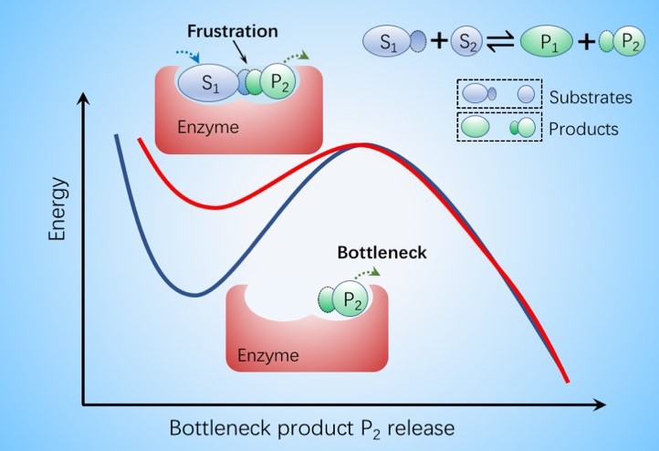 图1: 酶分子利用底物-产物空间阻挫克服催化循环限速步骤。催化循环中,新底物分子(S1)在上一循环产物(P2)释放之前结合,产生底物-产物共存复合体。由于底物-产物之间的空间阻挫效应,化学势驱动下的底物结合能够有效降低产物释放能垒,从而以主动方式加速限速步骤的发生和催化循环。
