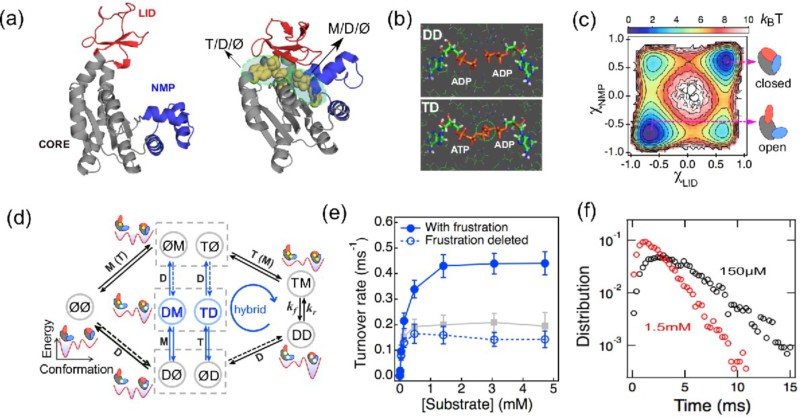 图2: 作为多底物酶模型的腺苷酸激酶催化机制(负责催化磷酸根转移反应ATP+AMP?ADP+ADP)。(a)腺苷酸激酶在“开态(失活态)”(左)和“闭态(活性态)”(右)的结构卡通图;(b)底物(ATP)-产物(ADP)共存态的活性位点结构以及其空间阻挫示意图;(c)腺苷酸激酶在空载状体的构象自由能面;(d)腺苷酸激酶单分子催化循环的动态能量面理论模型示意图;(e)系综层次的催化动力学以及底物-产物空间阻挫效应对催化速率的贡献;(f)单分子层次的催化时间分布。