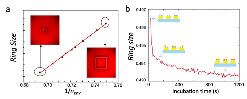 图2 (a)渐变图案等离激元传感器的共振环大小与折射率的倒数成正比关系,(b)痕量蛋白分子样品(20 μL, ~10 nM)的特异性吸附实验。