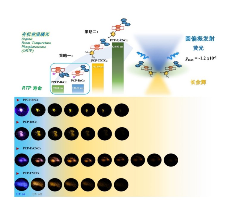 长余辉现象是在移除外置激发光源的条件下,材料仍表现出肉眼可见的发光现象。长余辉现象在自然界并不少见,但是基于纯有机的长余辉材料的研究直到最近几年才开始报道,可以用作生物传感、信息加密防伪和有机电致发光器件等应用,是目前新兴的研究热点。但是目前有机长余辉材料的设计仍较为困难,特别是具有高效率、长寿命的材料仍然是目前有机长余辉材料研究的重点和难点。同时,手性发光材料由于可以发射圆偏振光,在3D显示、信息加密、存储以及不对称光催化等方面具有潜在的应用价值,近年来受到越来越多的研究关注。但是目前报道的兼具手性发光和长余辉发光的材料,且非对称g因子(与圆偏振发射直接相关的参数,数值越大越好)均比较小。