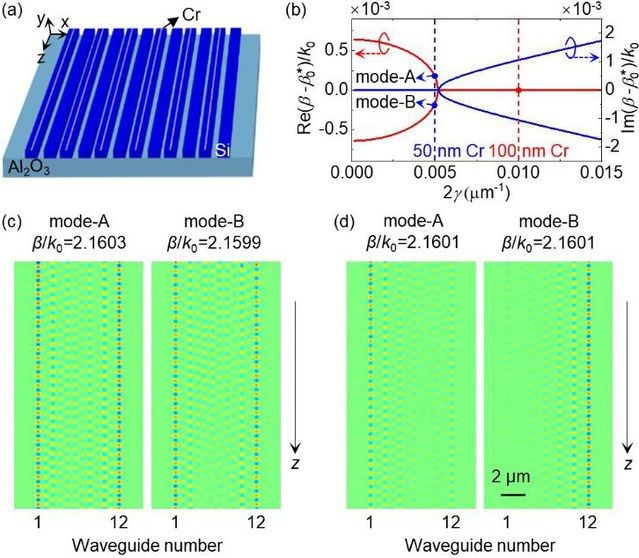 (a)利用硅波导镀铬来实现非厄米光波导阵列;(b)理论计算的零模模式常数随非厄米调制的关系;(c, d)准零模以及通过非厄米调制实现的严格零模在硅波导阵列中的演化。