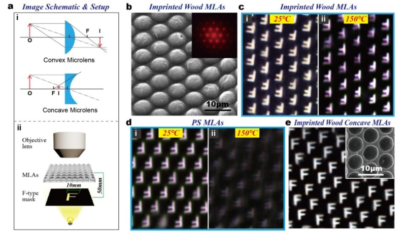 图3 木材基微透镜阵列的展示。a)使用MLA的光学成像装置原理图,其中图像效果以“F”字符为目标进行演示。b) 凸木MLA微球直径≈6.5μm的SEM照片。插图是光散射点图案。它们的周期性排列表明了大范围内MLA的周期性。c)木MLA的成像效果,其中清晰的字母“F”边缘清晰可见。d)相比之下,在150°C时PS MLA图像不清晰。e)凹木MLA也表现出良好的图像效果。