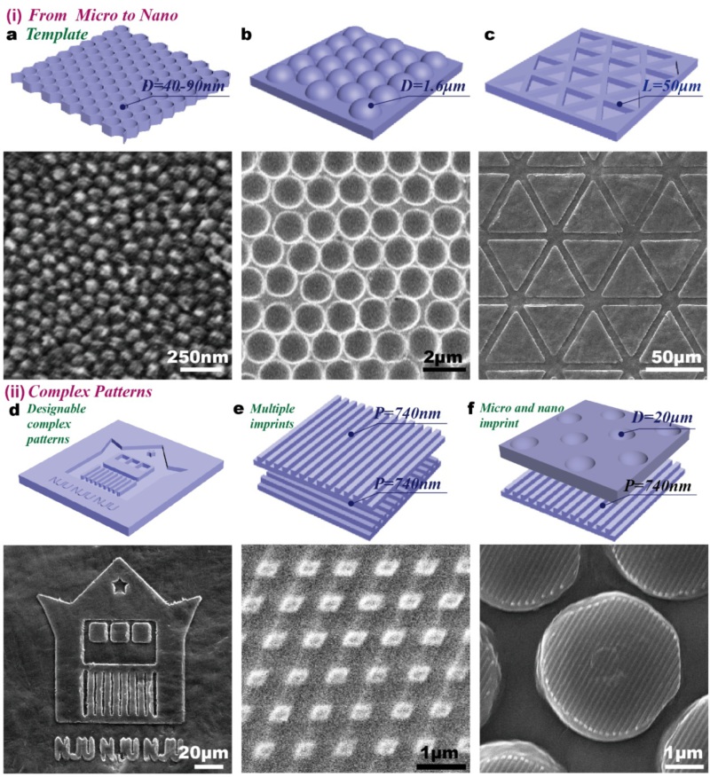 针对上述研究目标和挑战,该团队基于木材及其纤维分级结构特点,通过部分去除木质素使微纤丝之间可移动,获得木材的类似塑性的力学特性,并在室温、潮湿条件下对木材表面进行纳米压印,然后通过干燥重新形成纤维间的氢键,从而将微纳结构完整、精确地复制到木材表面,实现了木材表面结构的尺寸范围从纳米到微米大跨度的图案的制备与调控。