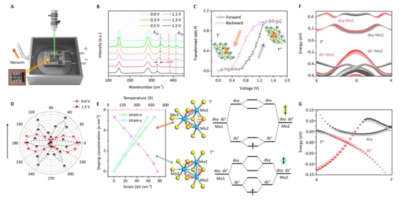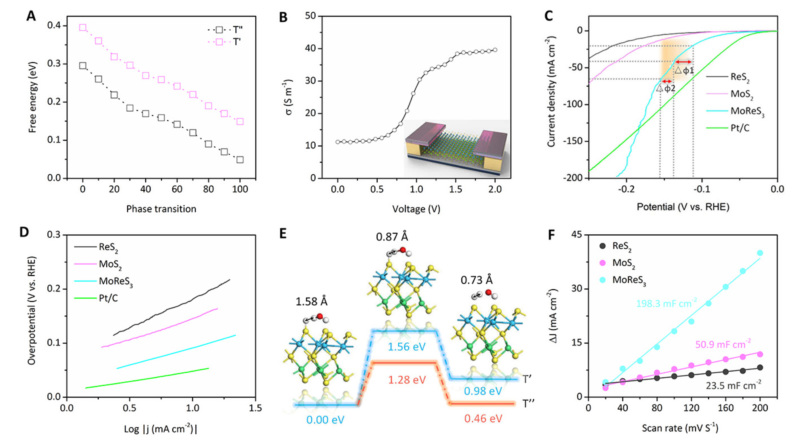 研究团队通过配位自组装的方法,将半层的Td相ReS2键合到畸变的T相MoS2层去形成一种新型的具有反对称面外结构的Janus (双面神)MoReS3 的T’相结构,此结构易受外加电场影响产生结构转变,形成能快速实现载流子转移和同时具有更高催化活性的新T”相结构。通过原位拉曼检测E2g和A1g模,发现在1.3V电压下E2g和A1g分别发生偏移和消失,证明了复合MoReS3?纳米片产生了从T’到T”的结构转变。理论计算表明,特有的结构非对称引起的自发极化使得载流子滞留到ReS2/MoS2 界面产生电致应力,由此有效地降低了T’到T”的相变势垒,施加很小电压即可实现电子结构调控。此种仅依靠电极电压实现催化剂微结构和物理特性的调控方法,为新型多功能电极设计提供了可能。