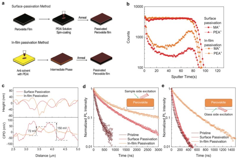 图1. 与表面钝化相比,在反溶剂中添加苯乙胺提升钙钛矿内部的均匀钝化。