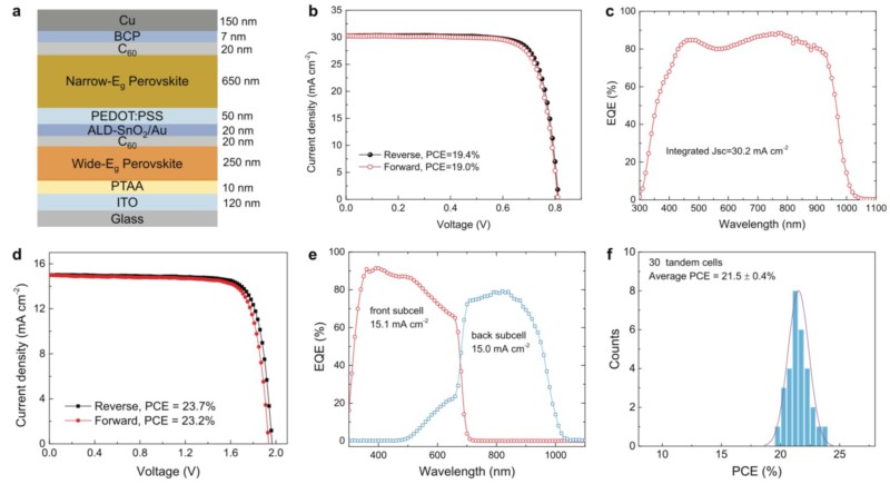 图2. 优化钙钛矿层厚度后单节Pb-Sn钙钛矿电池获得了19.4%的光电转换效率,结合宽带隙钙钛矿制备的串联型全钙钛矿叠层电池效率达到23.7 %(稳态效率23.5%)。