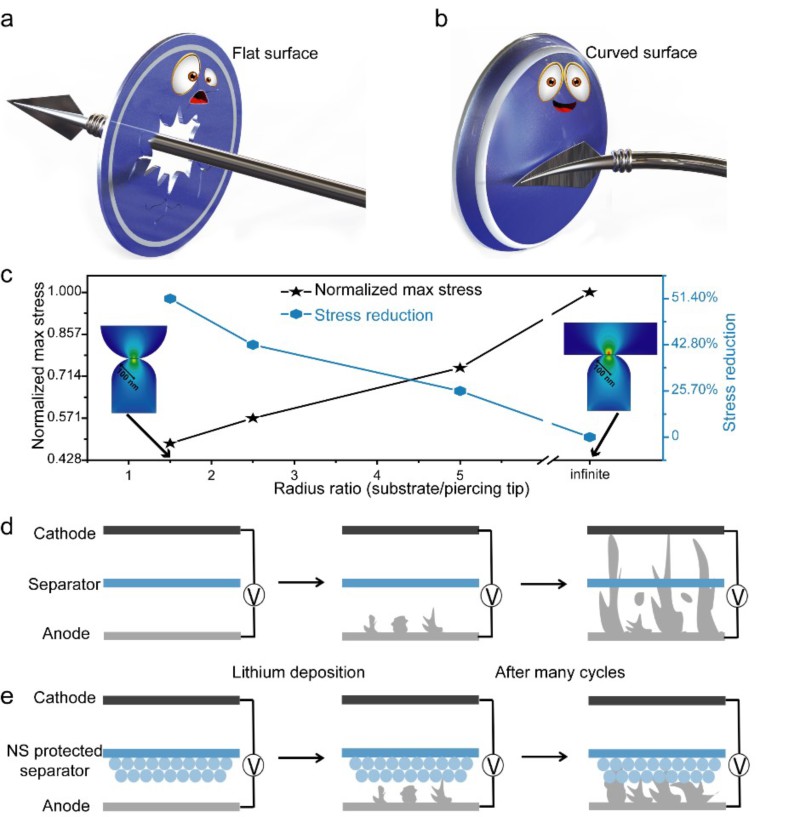 图 1 纳米盾牌修饰隔膜的示意图:a-b)不同曲率的盾牌效果示意图;c)不同曲率盾牌所受最大应力及应力降低的模拟计算分析结果;d-e)普通隔膜和纳米盾牌修饰隔膜应对锂枝晶生长的对比图。