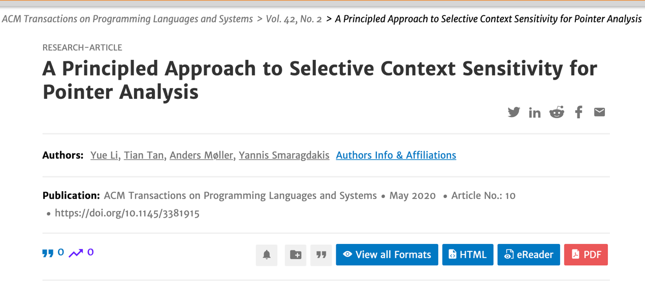 该成果在2020年5月20日,以"A Principled Approach to Selective Context Sensitivity for Pointer Analysis"为题发表于《ACM Transactions on Programming Languages and Systems》期刊上(TOPLAS 42(2)),凯发k8官网为第一及通讯单位,李樾为第一作者,谭添为通讯作者,丹麦奥胡斯大学Anders Møller教授、希腊雅典大学Yannis Smaragdakis教授为合作者。TOPLAS是程序设计语言领域的顶级国际期刊,也是CCF推荐A类期刊。该论文是TOPLAS自1979年创刊41年来,凯发k8官网首次、我国内地高校和科研机构第三次(近五年唯一)以第一单位名义发表的科研成果。”