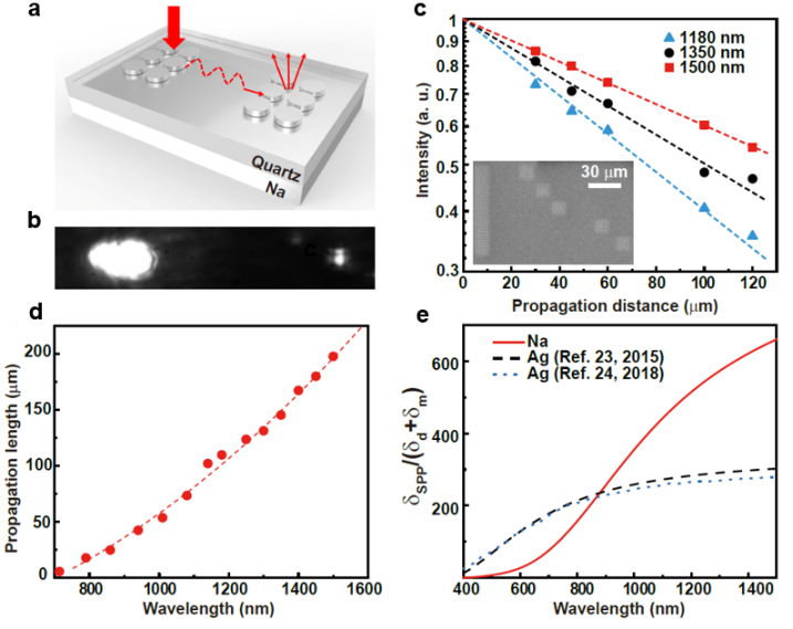 研究团队对钠基表面等离极化激元的传输特性进行了定量研究。如图2a所示,两端纳米柱阵列作为耦合结构实现空间光与波导中表面等离激元的耦入和耦出,通过测量不同传播距离的信号强度(信号强度降到初始值1/e时的传播距离)可以实现传播长度的定量标定。实验结果表明,在近红外波段(如1500 纳米),表面等离激元在钠-二氧化硅界面的传播长度可达200微米以上。此外,受益于独特的色散特性,钠基等离激元波导具有更强的横向电磁场局域效应和更小的模式尺寸。在近红外波段,钠基波导的品质因数是金属银的两倍以上。