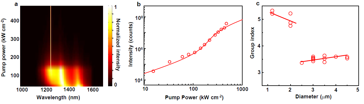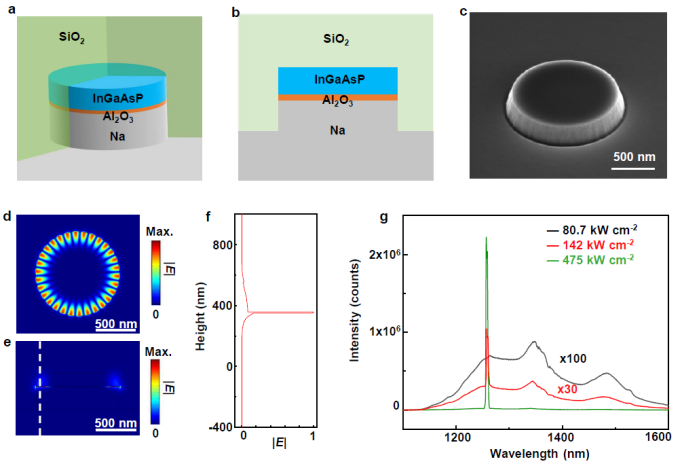 研究团队设计并制备了基于金属-绝缘体-半导体复合微纳结构的激光器件(图3)。实验结果表明,将低损耗的钠基等离激元结构与高品质因子的InGaAsP量子阱结构相结合,可有效降低整个器件的欧姆损耗和辐射损耗,制备的钠基等离激元激光器的室温激射阈值约为140千瓦每平方厘米(图4),创造了同类型纳米激光器阈值新低。