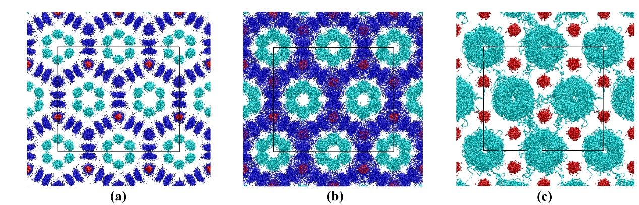 图2:在不同温度下,He3CH4晶体中碳原子(红色),氢原子(蓝色)和氦原子(湖蓝色)的运动行为。(a)固态,(b)塑晶态,(c)塑晶态和超离子态共存。为了显示方便,(c)中不包含氢原子轨迹。