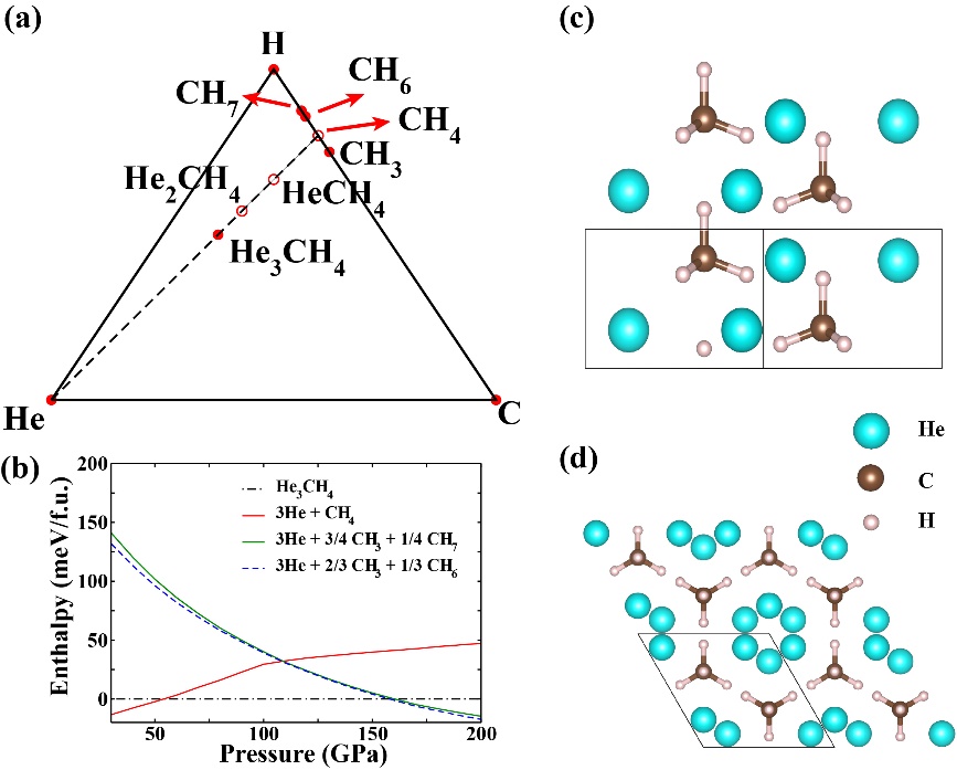 孙建教授课题组用自行开发的基于机器学习的晶体结构搜索方法和第一性原理计算,对氦和甲烷在高压下的化合物,以及它们在高温高压下的物态进行了系统研究,得到了一系列令人惊奇的理论结果。他们预言,氦和甲烷在高压下能形成氦-甲烷比例为 3:1的稳定化合物(如图1)。