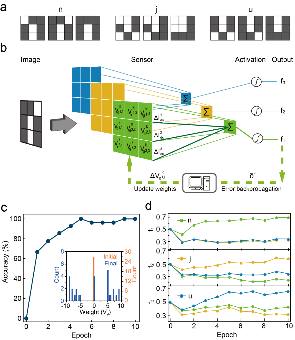 基于范德华异质结器件的功能应用除了同步的探测和信息的处理之外,研究团队发现器件阵列还可以用于图片的分类任务。通过将器件电导作为神经网络的权值,背栅的调节变化作为更新神经网络权值的一种手段,范德华异质结器件阵列可以执行神经网络的功能。研究团队在实验中采用软件辅助硬件的训练方法实现了对输入图像"N"," J", "U"字母的快速识别(图3)。这一项工作从原理上证明,利用范德华异质结的特性模拟人类视网膜结构和功能的研究思路有望将来被用来实现新型的类脑视觉芯片。
