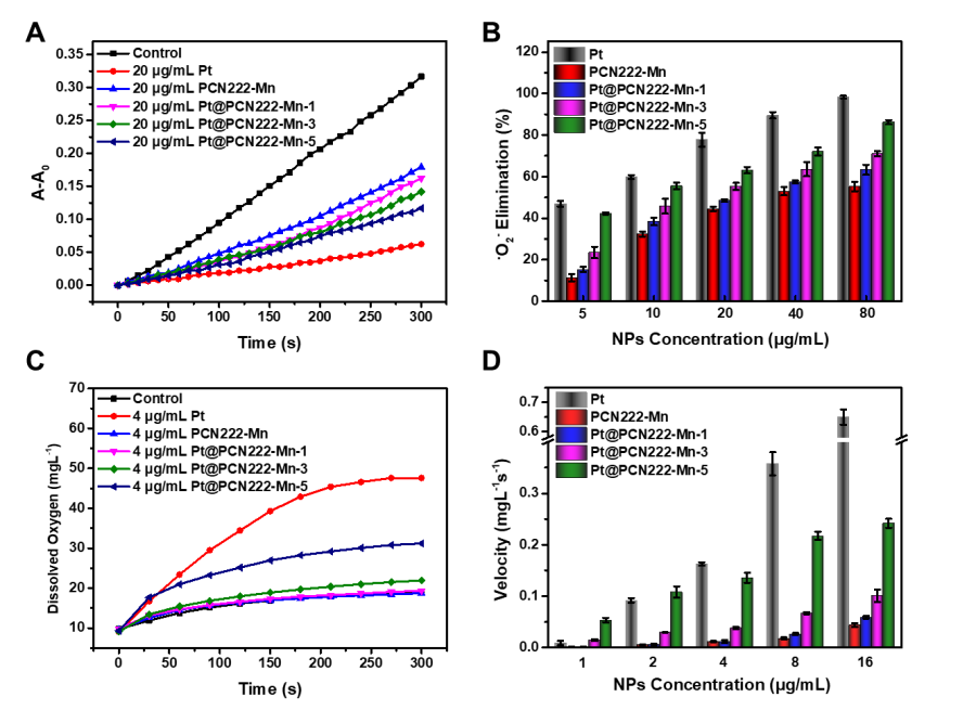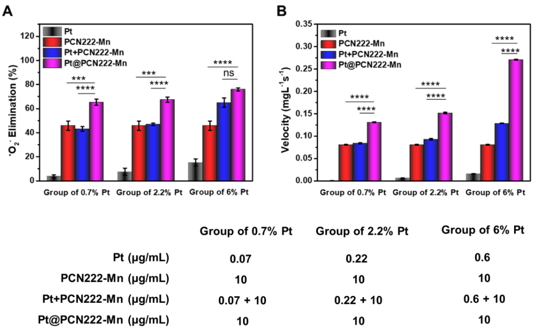 3 APtPCN222-MnPt+PCN222-MnPt@PCN222-Mn-5的超氧自由基抑制效率。(B)过氧化氢在分别加入PtPCN222-MnPt+PCN222-MnPt@PCN222-Mn-5后前60 s的溶解氧产生速率。数据是平均值 ± 标准偏差(n = 3)。***P < 0.005, ****P < 0.001, ns="not" significant, t-test.