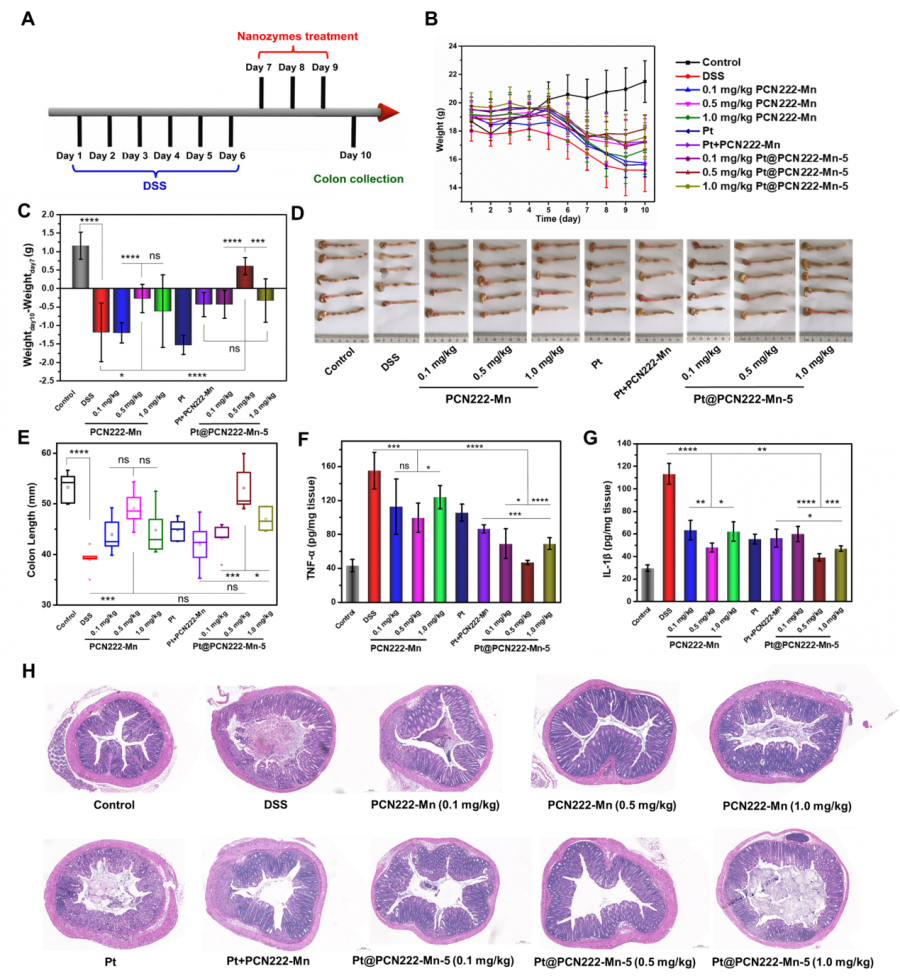 最后,将级联纳米酶Pt@PCN222-Mn-5应用到小鼠体内炎症性肠病的治疗中(图4)。通过对体内实验中级联纳米酶的协同作用的研究,表明Pt@PCN222-Mn-5的确具有协同催化清除ROS的能力,而且通过对给药剂量的优化实现了对溃疡性结肠炎的良好治疗效果。此外,本研究又用优化出来的给药浓度成功地实现了对克罗恩肠炎的治疗。