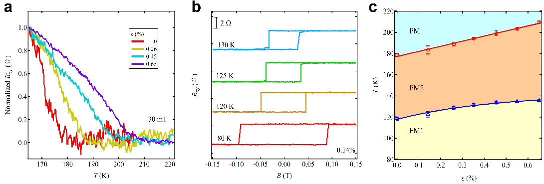 研究成员还研究了FGT样品在应变-温度平面的相图。首先,研究成员在不同应变下对霍尔电阻Rxy进行变温测量,并通过Rxy为零的转折点确定居里温度Tc。结果显示随着应变的增加,Tc得到了显著的提升(图2a)。随后,研究成员通过不同应变下的磁滞回线随温度的变化获得迷宫型多磁畴态和单磁畴态之间的转变温度Tl。例如,当应变固定在0.14%时,磁滞回线在120K以下时呈现矩形,而在120K以上时呈现出不规则形状,实现了单磁畴态和迷宫型多磁畴态的转变(图2b)。基于上述居里温度Tc、磁畴转变温度(Tl)同应变的依赖关系,研究人员得到了单磁畴态、多磁畴态以及顺磁态在应变-温度平面的边界,并绘制了相图(图2c)。相图显示随着应力的增加,Tc近乎线性地增长,而Tl则会先增加然后趋于饱和。由于层状材料一般具有较大的应变承受能力,因此可以预期FGT样品的Tc在大应变调控下可以实现大幅的增长。