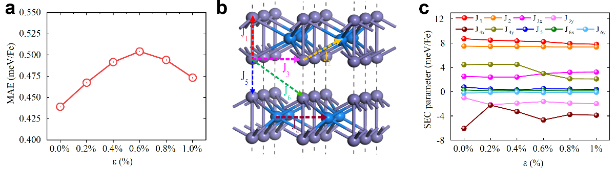 图3. (a)磁各向异性能随着单轴应力的变化曲线;(b)Fe3GeTe2晶格中磁交换作用的示意图;(c)磁交换作用随着单轴应力的变化曲线。