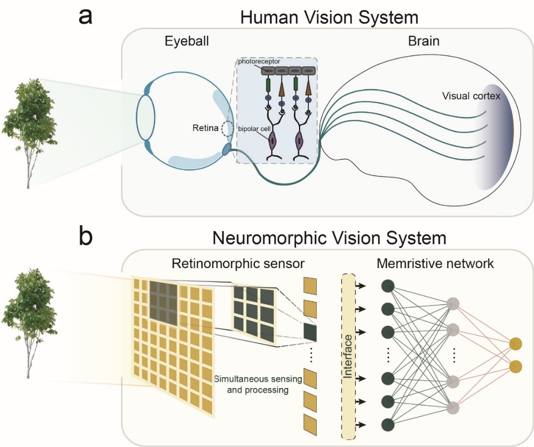 图1:人类视觉系统和类脑视觉系统。人类视觉系统主要由视网膜和大脑皮层视觉中枢组成;对应地,类脑视觉系统主要由可重构视网膜传感器和忆阻器交叉阵列所构成。