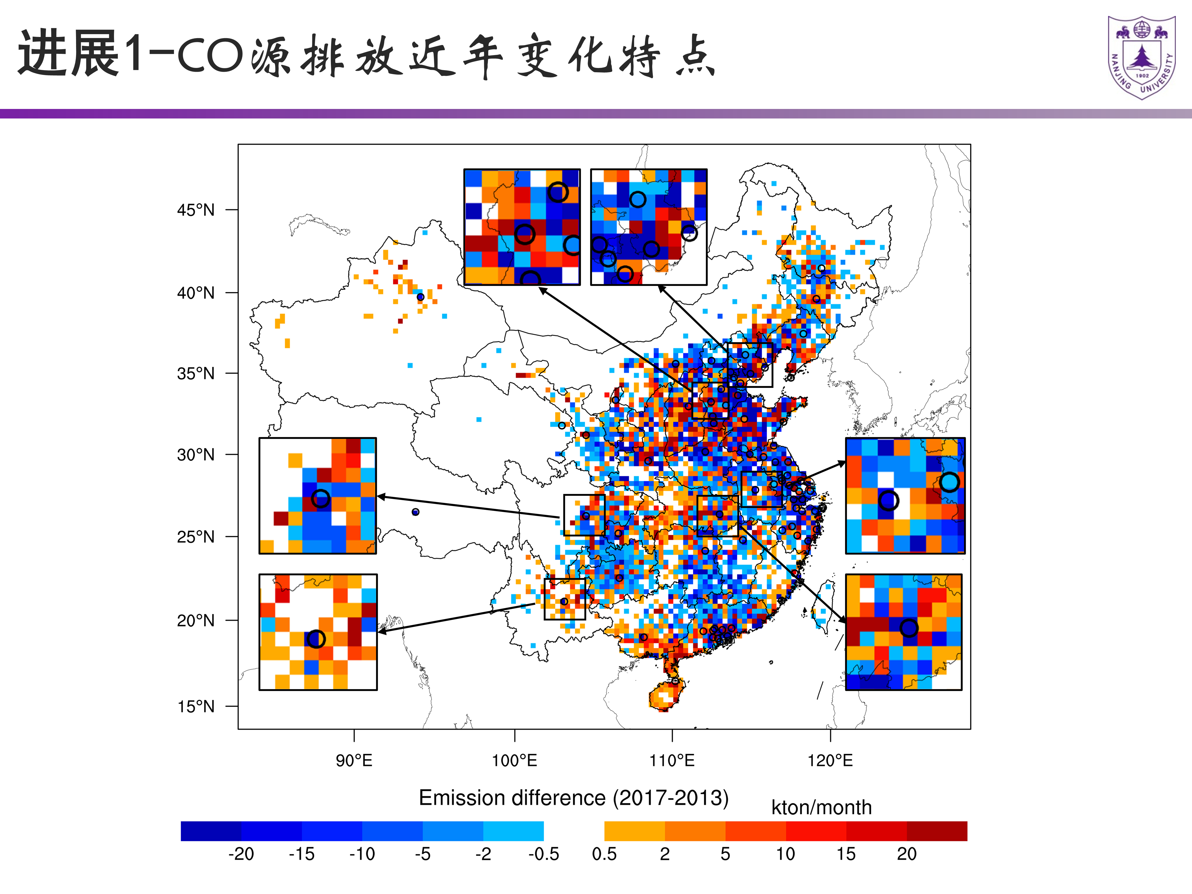 图3. 基于大气浓度观测数据反演的2017年相对2013年CO排放空间变化