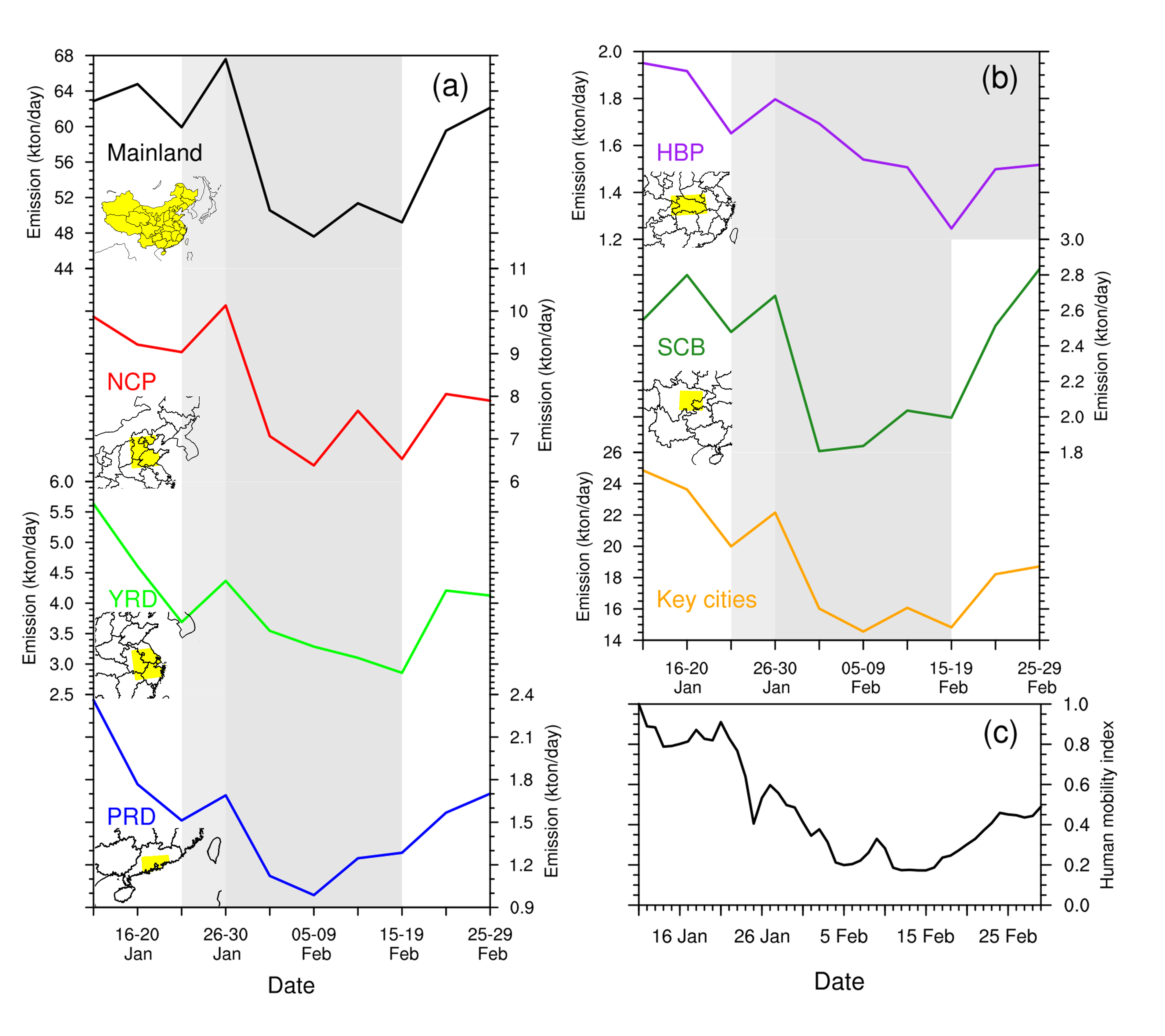 图1. 不同区域每5天平均的NOx排放及重点城市归一化迁徙规模指数变化