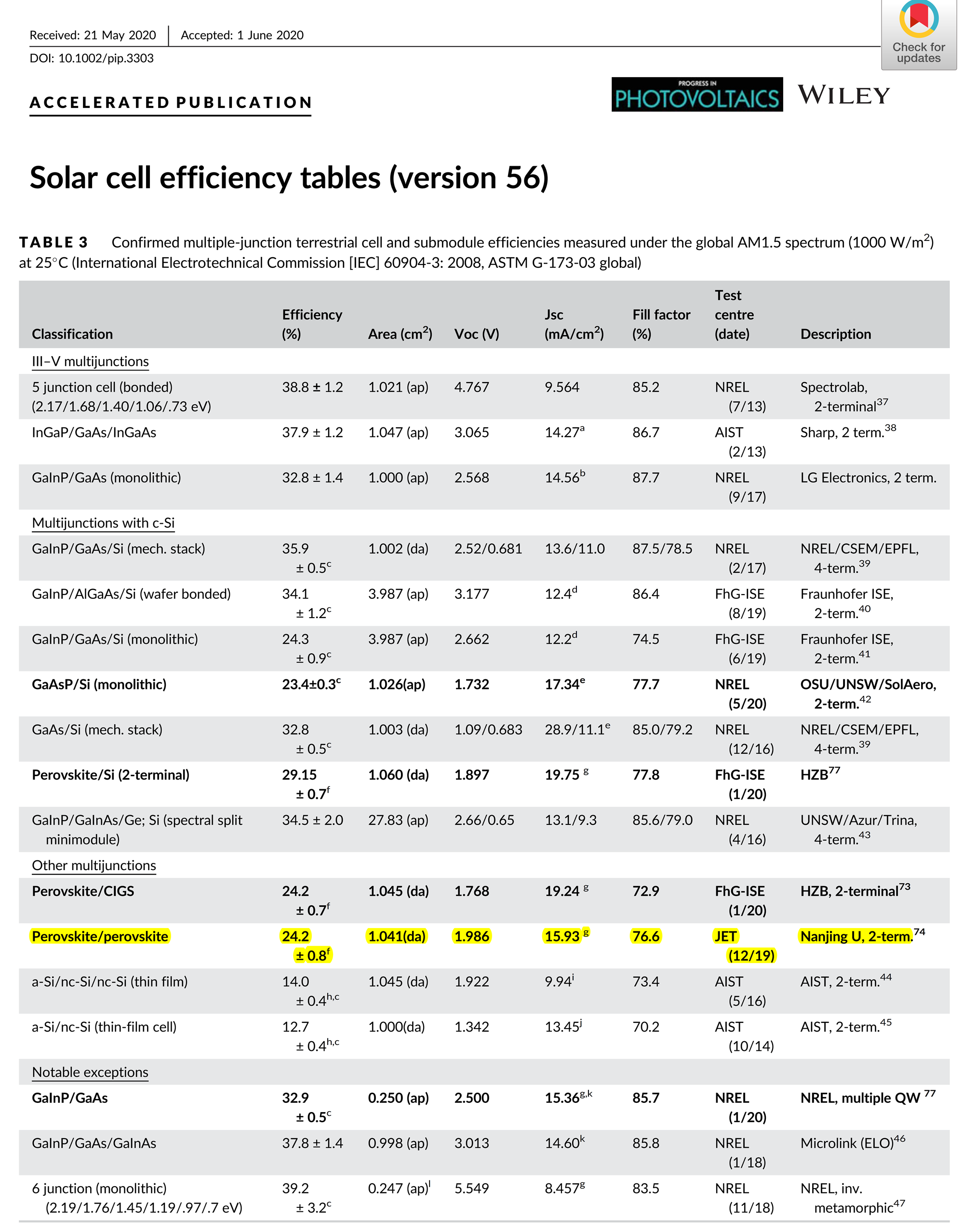 3. 最新叠层太阳能电池的世界记录效率表(version 56