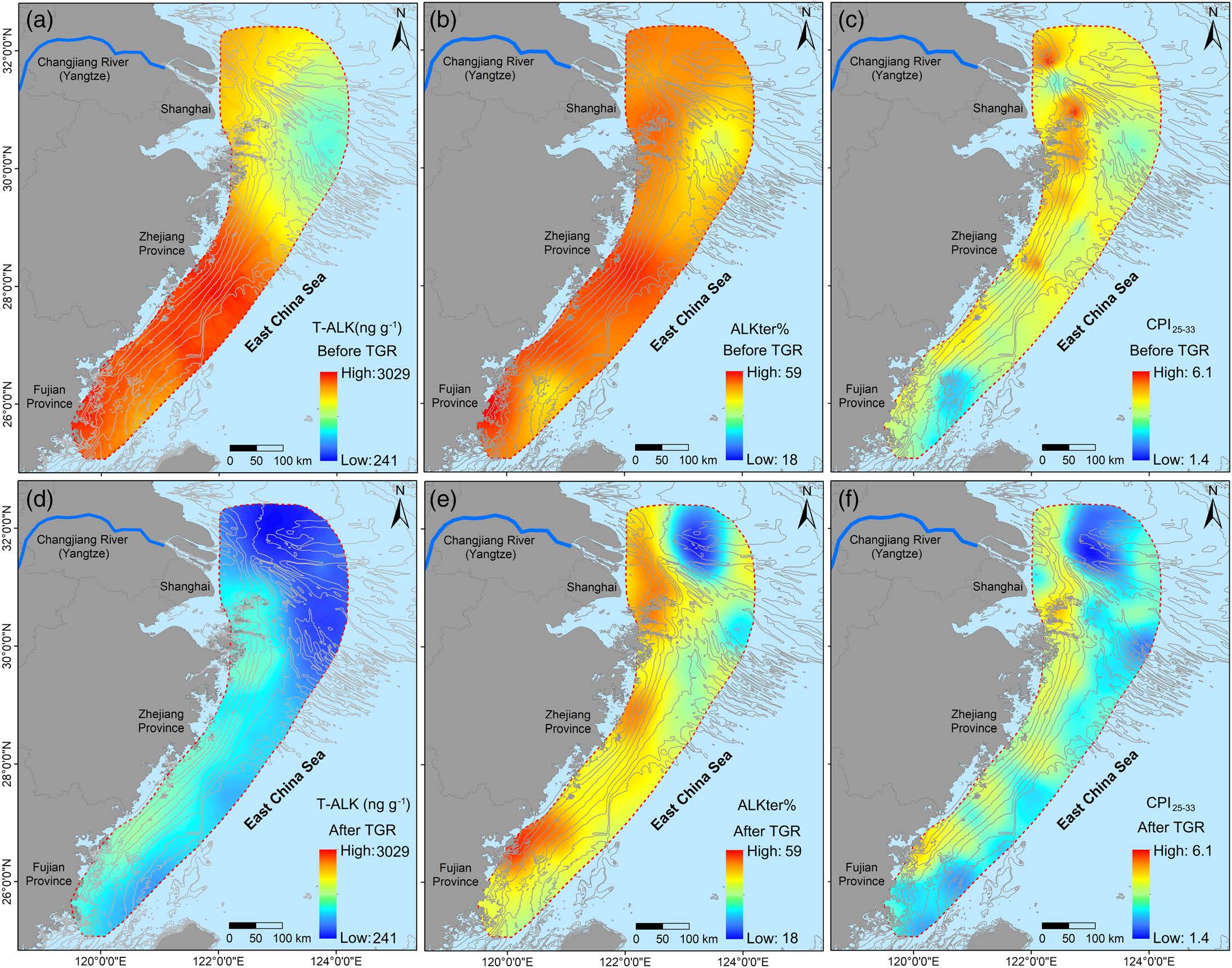沉积有机质的研究结果显示,2018年研究区表层沉积物中TOCn-alkanes含量相较于2006年显著降低(图2),河口外陆架区和浙-闽沿岸泥质区的下降幅度最为明显。C/N比值的结果显示,陆源有机质的相对含量有所下降,尤其是在河口区的下降趋势明显,但δ13C的变化特征并不一致。ALKter%C27C29C31 n-alkanen-alkanes总量的相对比例)的研究结果显示,2018年长江河口-陆架区表层沉积物的ALKter%相较于2006年表现出明显的下降趋势。此外,2018年研究区表层沉积物的CPI25-33指数相较于2006年也表现出较为明显的下降趋势。由以上多个指标的研究结果发现,研究区表层沉积物中陆源有机质的相对比例呈下降趋势,而流域工程建设导致的陆源颗粒有机质输入通量减少可能是导致这一现象的关键影响因素之一。