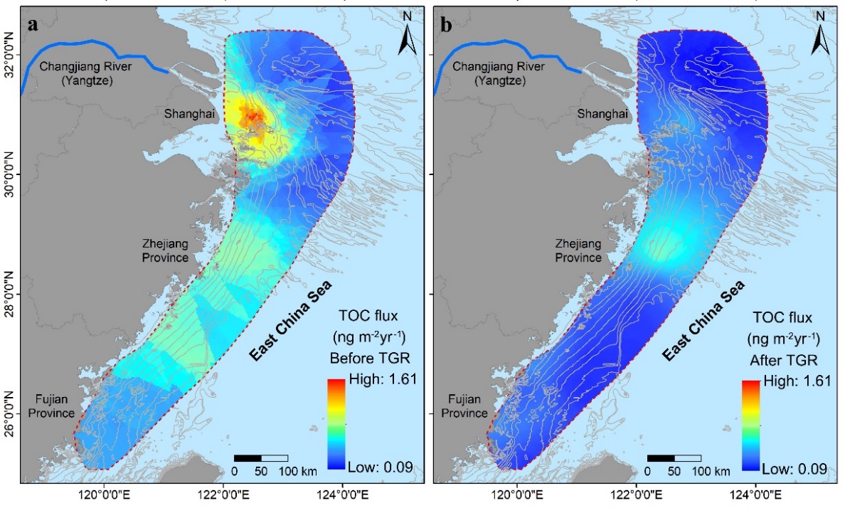 我国东海属于典型的受大河影响的陆架边缘海,长江每年向其输送大量颗粒有机质。巨量陆源物质入海后在长江河口-陆架区形成典型的泥质沉积体,为颗粒有机质提供了良好的埋藏场所。随着流域工程活动不断加剧,长江入海泥沙通量显著减少,并导致长江河口-陆架区的底床沉积物发生再分配,从而可能影响颗粒有机质的输运和沉积过程。地理与海洋科学学院邹欣庆教授团队,围绕这一问题,开展了全面深入的研究,取得了一系列新进展。近期,他们在国外重要学术刊物Geophysical Research Letters, Water Research, Journal of Geophysical Research: Oceans等发表多篇论文,论证流域工程影响下长江河口-陆架区沉积有机质的时空分布变化及其响应机制