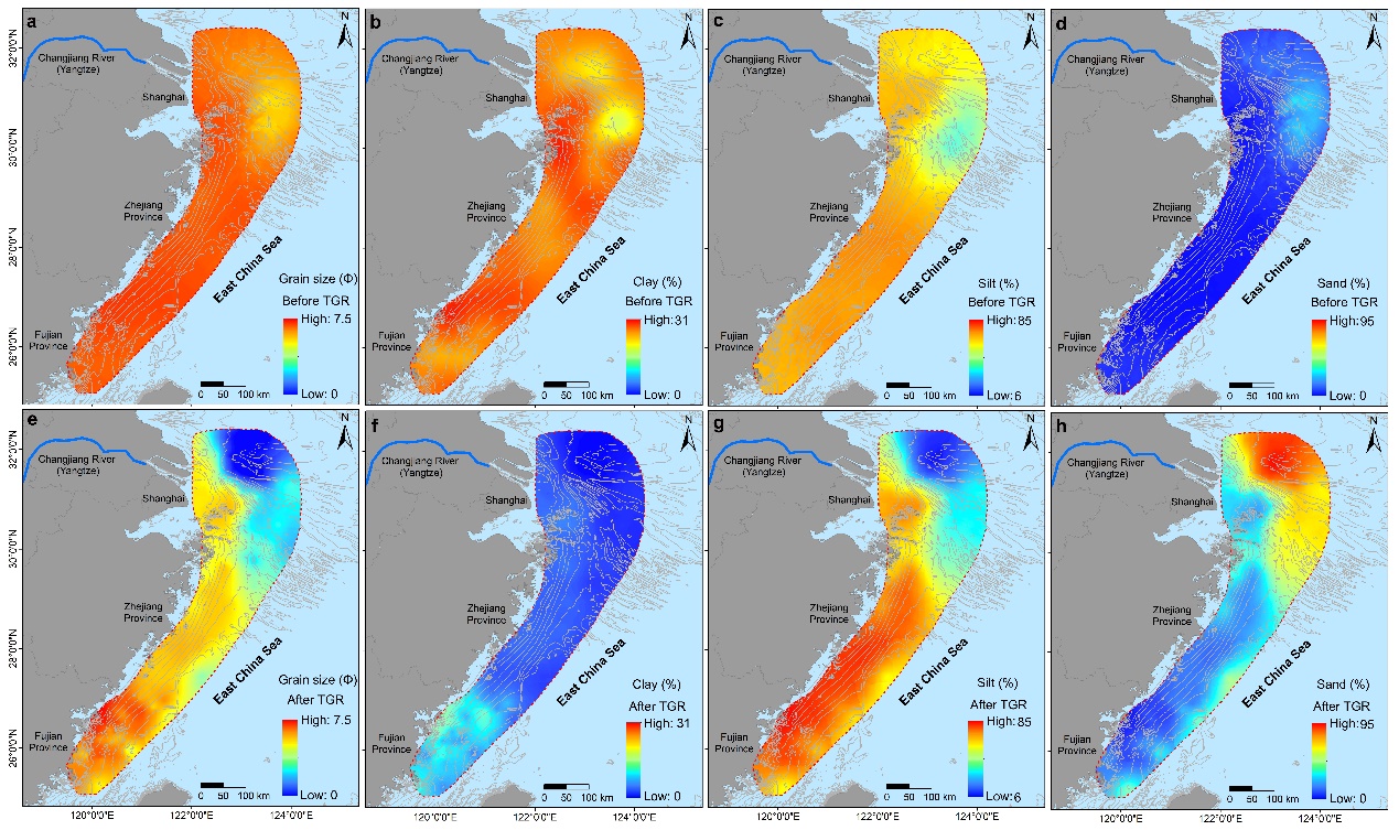 研究团队以三峡水库蓄水为时间节点,通过分析前人研究发现2006年长江河口-陆架区的沉积环境相较于水库蓄水前并没有发生明显变化。研究团队以长江河口-陆架区2006年和2018年两期表层沉积物为研究对象,总有机碳及其稳定碳同位素(TOCδ13C),生物标志物(正构烷烃(n-alkanes)、四醚膜脂(GDGTs)),人为源有机质多环芳烃(PAHs),典型环境污染物有机氯农药(OCPs)以及沉积物粒度参数等为示踪指标,探究了流域水库建设背景下研究区沉积有机质来源、组成、空间分布格局及沉积通量的变化特征。研究结果发现,三峡水库蓄水后长江河口-陆架区表层沉积物组成及空间分布格局均发生明显变化(图1)。表层沉积物粒度粗化明显,且表现出明显的空间分异性,沉积物粒度由北向南逐渐细化(图1a,e)。粘土组分含量在整个研究区均表现为显著下降(图1b,f),粉砂组分含量表现为北部河口区显著降低,南部浙-闽沿岸泥质区有一定程度的升高(图1c,g),砂质组分含量则表现为河口区显著升高,浙闽沿岸泥质区有一定程度升高(图1d,h)。在此背景下,表层沉积物中有机质的含量、空间分布格局以及沉积通量等关键参数均发生了明显变化。