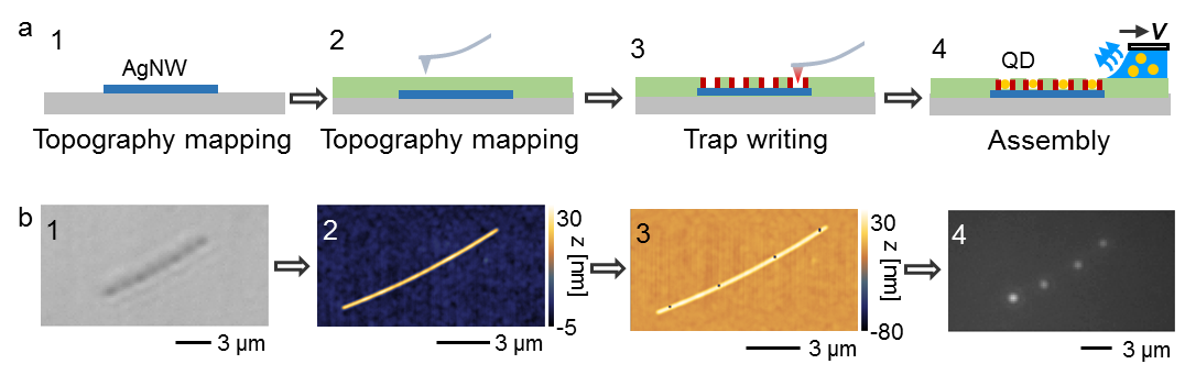 图3 量子点-银纳米线异质结构的制备 a)制备过程示意图 b1)单根银纳米线光镜照片 b2)对应的银纳米线形貌扫描图 b3)在银纳米线顶部制备微结构 b4)组装量子点后的荧光图像