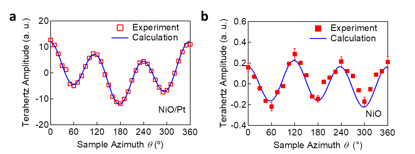 图2a和2b分别展示了NiO/Pt结构和NiO薄膜的太赫兹发射幅值对其样品旋转角度的依赖性,两者都呈现120°周期特征。图中实线为基于非线性光学理论计算所得的拟合结果,与实验结果高度吻合。另外报道中还对泵浦激光的偏振方向和NiO薄膜的晶向等参数的影响做了研究,进一步验证了NiO中的非线性光学过程是其产生瞬态磁化的物理机制。研究中的实验测量皆在零磁场条件下完成。零磁场条件下反铁磁可产生超快自旋流的现象的发现,为反铁磁自旋电子学、高速安全的存储器件以及新型太赫兹源的研究提供了全新的思路,在太赫兹与反铁磁自旋电子学交叉领域中取得了创新性突破。