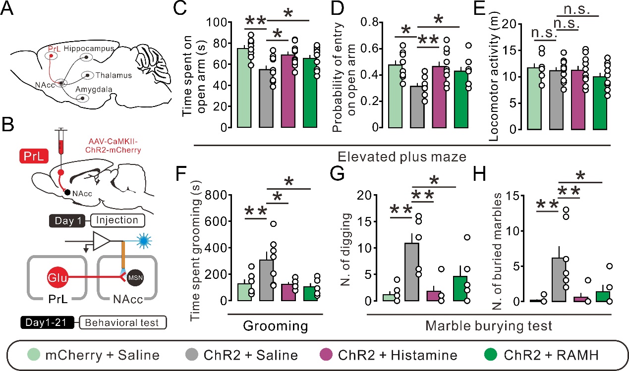 图2. 激活组胺H3受体改善由光遗传学选择性激活PrL-NAc谷氨酸能神经环路诱导的焦虑伴发强迫症样行为。
