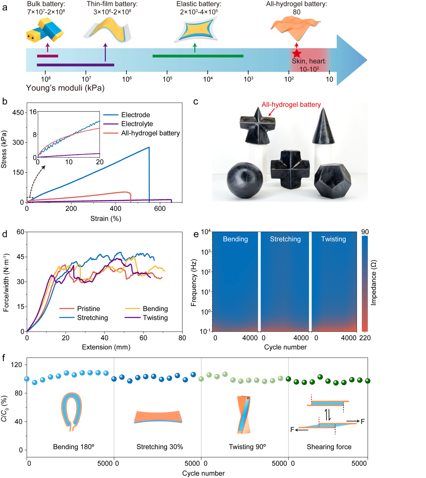 近年来,可穿戴和可植入生物电子器件蓬勃发展,在疾病诊疗、大健康、人机接口、电子通讯等领域显示出巨大的应用前景。能源系统如各种化学电池是植入式电子器件的心脏,为其提供能量。然而目前使用的刚性电池系统,无法与柔软的生物组织相匹配,迫切需要开发与生物组织力学性能(如杨氏模量)相匹配的的柔软电池,确保在动态变形下,器件与不规则生物组织表面的持续稳定贴合并最大程度减少组织应力;同时缓解物理扰动及其对组织的损伤,从而减轻异物反应和健康威胁。