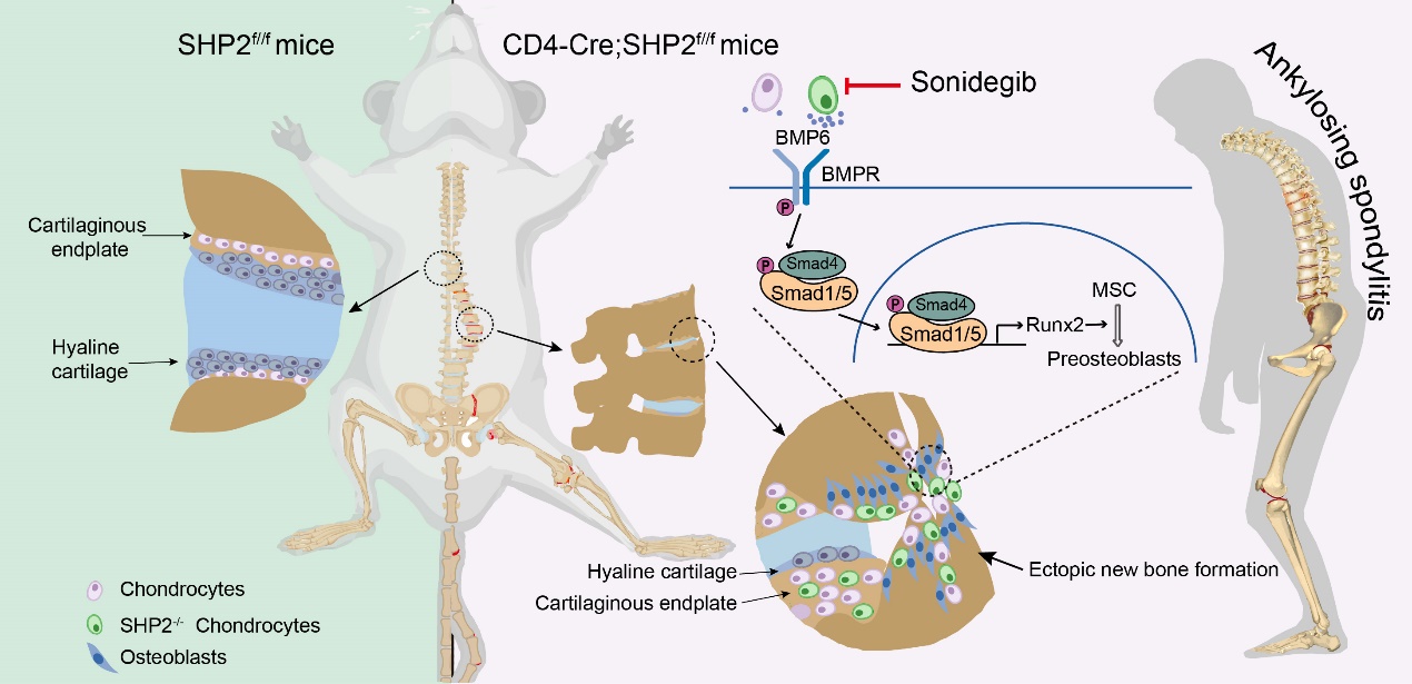 香港浸会大学中医药学院副院长、罗守辉骨与关节疾病转化医学研究所副所长、精准医学和创新药物研究所所长张戈教授评价道:长期以来,由于难以从患者脊柱关节获取组织,以及缺乏贴近临床表型的理想动物模型,强直性脊柱炎的发病机制研究举步维艰。近日,孙洋、徐强团队通过偶然发现的CD4-Cre条件性敲除SHP2的小鼠出现自发强直样表型(骨变形、骨赘、骨质疏松和骨融合),并以此小鼠为模型揭示了生长板闭合延迟是强直性脊柱炎发病的一种崭新机制,CD4-Cre条件性敲除SHP2的小鼠可作为一种新的探究强直性脊柱炎发病机制、干预靶标以及药物研发的理想实验动物模型。