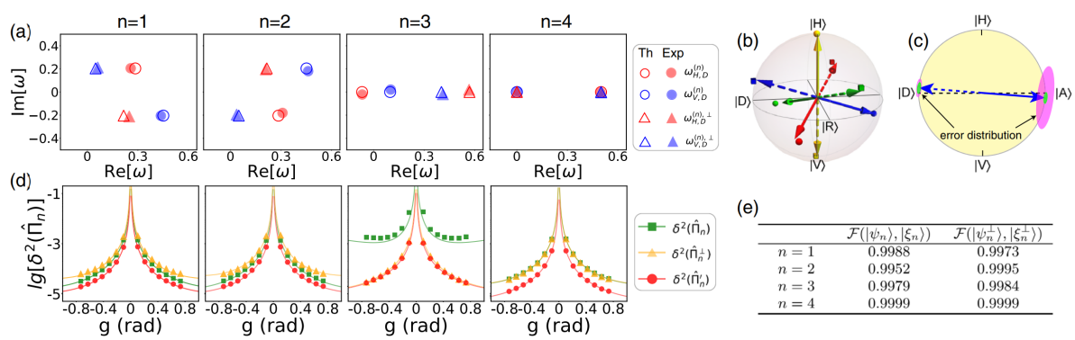 图2. 对偏振投影测量进行直接表征的实验结果(a、b)与精度分析(c、d)。(e)直接表征结果与传统表征结果的保真度。