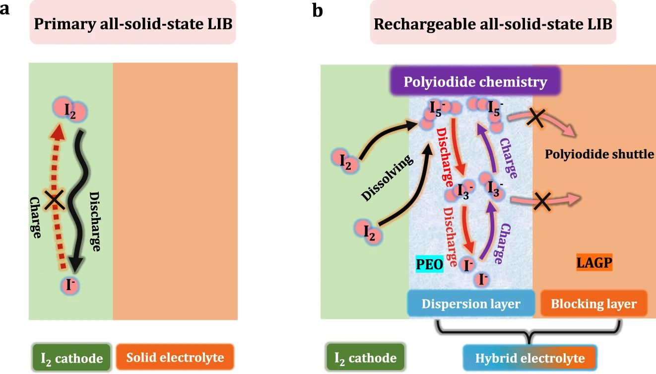随着化石能源的逐渐枯竭和自然环境的不断恶化,人类社会对绿色环保的高比能电化学能源系统的需求也愈来愈迫切。基于嵌入型正极材料、石墨负极与有机电解液的锂离子电池已广泛应用到我们的日常生活中,但其比能量已达极限,且在高温、过充等极端条件下易发生燃烧甚至爆炸事故,难以满足下一代高比能和高安全储能系统的要求。与传统的锂离子电池相比,基于碘正极和锂金属负极的锂-碘电池不仅拥有比能量高、成本低廉和环境友好的优势,且具有超长的循环寿命和优异的倍率性能。液态锂-碘电池的相关研究虽已取得了很多进展,但多碘离子的穿梭效应和有机电解液安全性差这两大难题始终阻碍着其发展和应用。全固态锂-碘电池采用不可燃的固态电解质,在提高电池安全性的同时,完全避免了多碘离子的穿梭效应,是非常具有吸引力的下一代新型电池体系。但是固态锂-碘电池由于多碘离子的界面化学过程缓慢导致的实际放电容量低、循环寿命差等问题一直难以解决,这严重制约该体系的实用化。